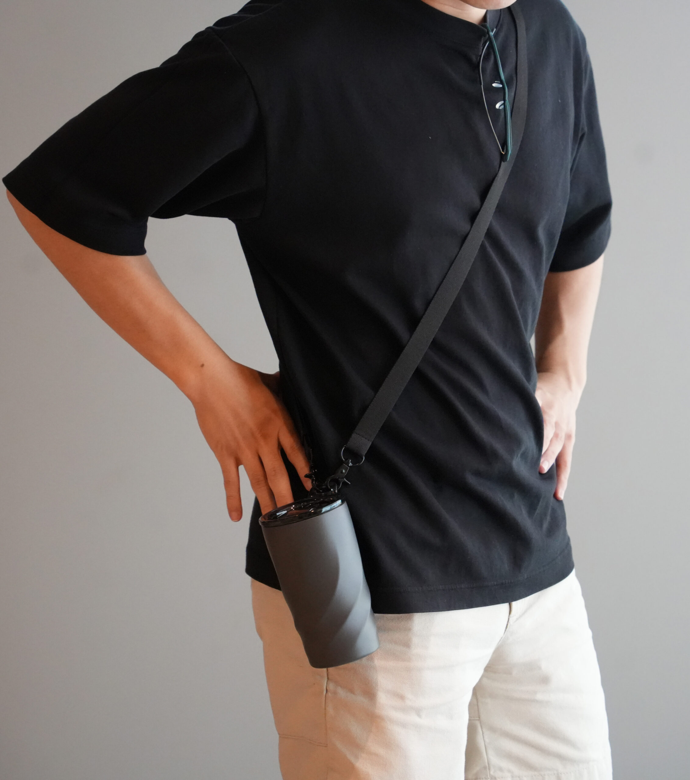 付属のストラップを使えば、肩掛けでハンズフリーに持ち運べます。